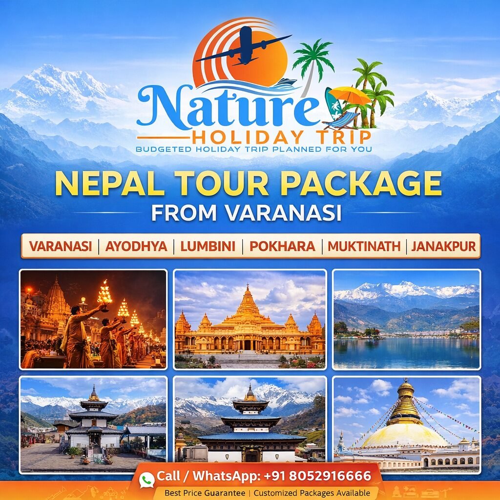 Nepal tour package from Varanasi is an ideal option for travelers who are looking for a perfect blend of spirituality, natural beauty, and a smooth international journey. This specially designed Nepal tour package from Varanasi starts from the holy city of Varanasi and covers Ayodhya, Lumbini, Pokhara, Muktinath, Kathmandu, and Janakpur, with a comfortable drop at Gorakhpur. The tour is thoughtfully planned for families, pilgrimage groups, and senior citizens who prefer road travel with comfort and complete assistance.